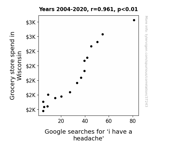 This means 92.3% of the change in the one variable (i.e., Google searches for 'i have a headache') is predictable based on the change in the other (i.e., Grocery store spend in Wisconsin) over the 17 years from 2004 through 2020.