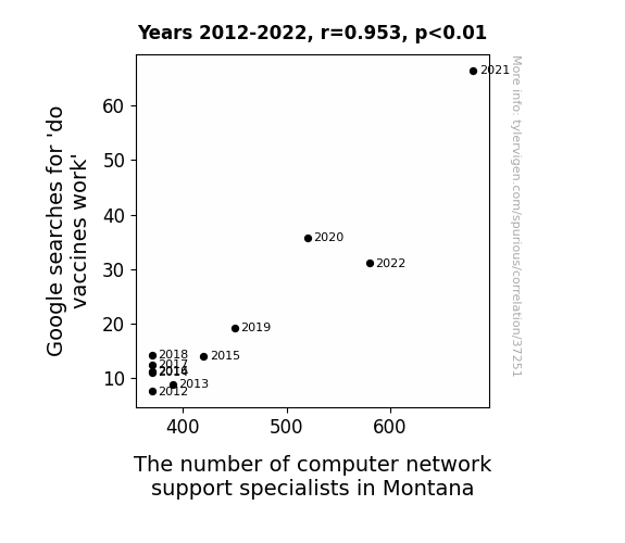 This means 90.9% of the change in the one variable (i.e., The number of computer network support specialists in Montana) is predictable based on the change in the other (i.e., Google searches for 'do vaccines work') over the 11 years from 2012 through 2022.