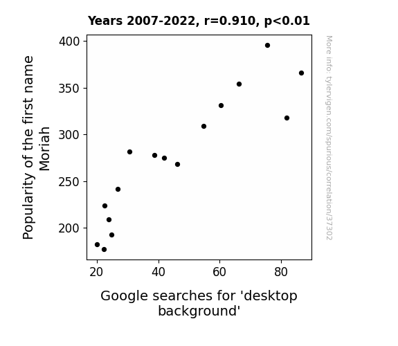 This means 82.8% of the change in the one variable (i.e., Google searches for 'desktop background') is predictable based on the change in the other (i.e., Popularity of the first name Moriah) over the 16 years from 2007 through 2022.