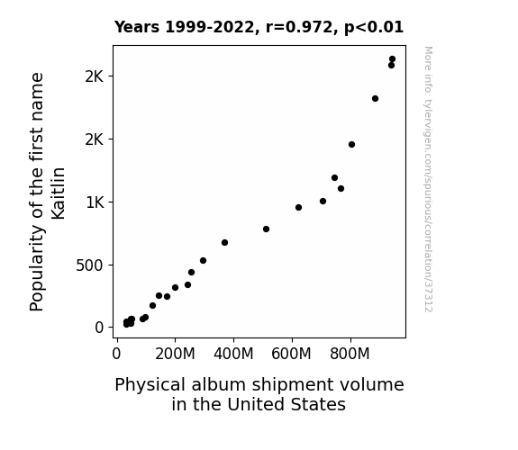 This means 94.5% of the change in the one variable (i.e., Physical album shipment volume in the United States) is predictable based on the change in the other (i.e., Popularity of the first name Kaitlin) over the 24 years from 1999 through 2022.