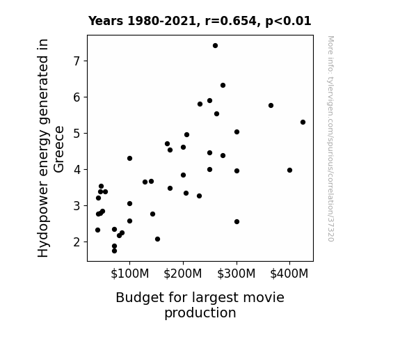 This means 42.7% of the change in the one variable (i.e., Budget for largest movie production) is predictable based on the change in the other (i.e., Hydopower energy generated in Greece) over the 42 years from 1980 through 2021.