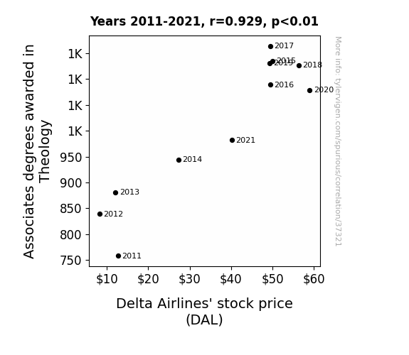 This means 86.3% of the change in the one variable (i.e., Delta Airlines' stock price (DAL)) is predictable based on the change in the other (i.e., Associates degrees awarded in Theology) over the 11 years from 2011 through 2021.