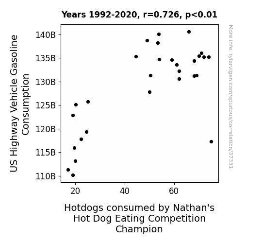 This means 52.7% of the change in the one variable (i.e., Hotdogs consumed by Nathan's Hot Dog Eating Competition Champion) is predictable based on the change in the other (i.e., US Highway Vehicle Gasoline Consumption) over the 29 years from 1992 through 2020.