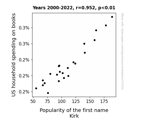 This means 90.7% of the change in the one variable (i.e., Popularity of the first name Kirk) is predictable based on the change in the other (i.e., US household spending on books) over the 23 years from 2000 through 2022.