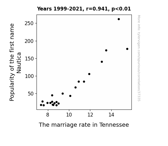 This means 88.6% of the change in the one variable (i.e., The marriage rate in Tennessee) is predictable based on the change in the other (i.e., Popularity of the first name Nautica) over the 23 years from 1999 through 2021.