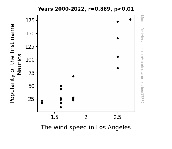 This means 79.1% of the change in the one variable (i.e., The wind speed in Los Angeles) is predictable based on the change in the other (i.e., Popularity of the first name Nautica) over the 22 years from 2000 through 2022.