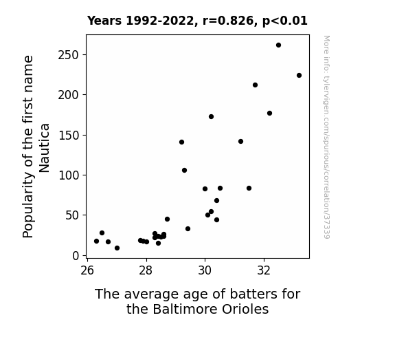 This means 68.2% of the change in the one variable (i.e., The average age of batters for the Baltimore Orioles) is predictable based on the change in the other (i.e., Popularity of the first name Nautica) over the 31 years from 1992 through 2022.