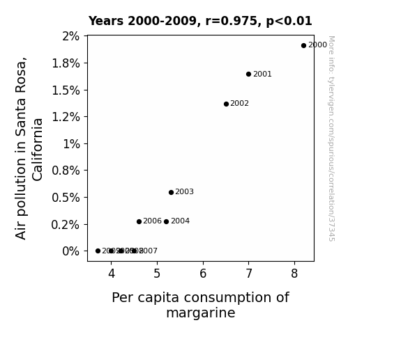 This means 95.1% of the change in the one variable (i.e., Per capita consumption of margarine) is predictable based on the change in the other (i.e., Air pollution in Santa Rosa, California) over the 10 years from 2000 through 2009.