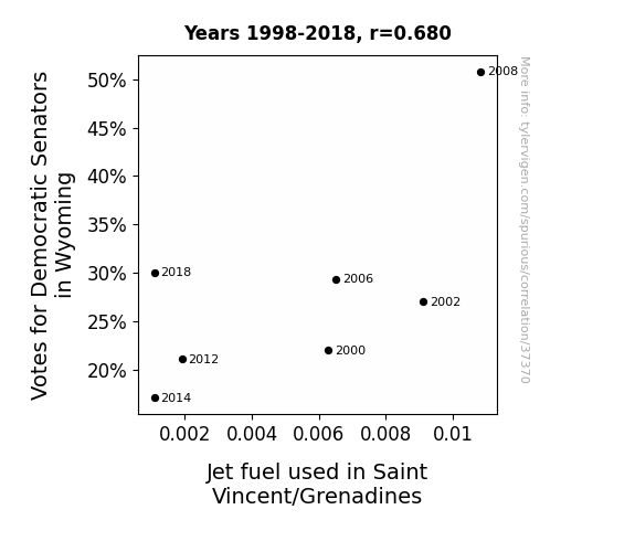 This means 46.3% of the change in the one variable (i.e., Jet fuel used in Saint Vincent/Grenadines) is predictable based on the change in the other (i.e., Votes for Democratic Senators in Wyoming) over the 7 years from 1998 through 2018.