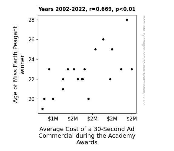 This means 44.7% of the change in the one variable (i.e., Average Cost of a 30-Second Ad Commercial during the Academy Awards) is predictable based on the change in the other (i.e., Age of Miss Earth Peagant winner) over the 21 years from 2002 through 2022.