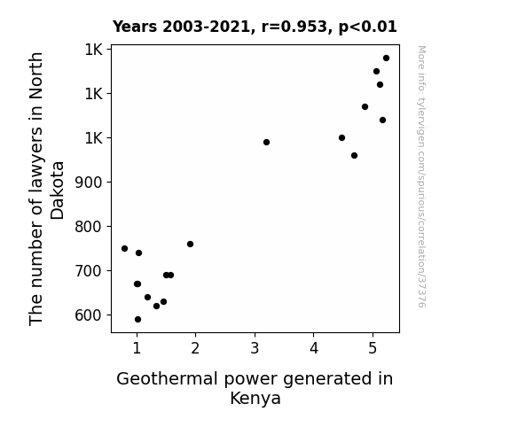 This means 90.9% of the change in the one variable (i.e., Geothermal power generated in Kenya) is predictable based on the change in the other (i.e., The number of lawyers in North Dakota) over the 19 years from 2003 through 2021.