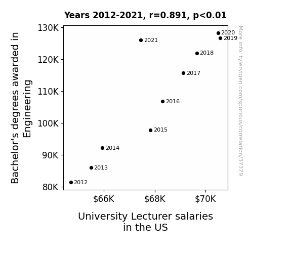 This means 79.4% of the change in the one variable (i.e., University Lecturer salaries in the US) is predictable based on the change in the other (i.e., Bachelor's degrees awarded in Engineering) over the 10 years from 2012 through 2021.