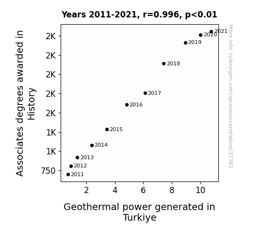 This means 99.2% of the change in the one variable (i.e., Geothermal power generated in Turkiye) is predictable based on the change in the other (i.e., Associates degrees awarded in History) over the 11 years from 2011 through 2021.