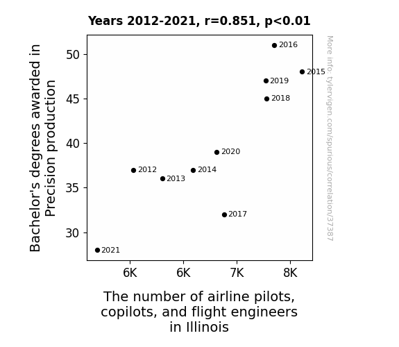 This means 72.4% of the change in the one variable (i.e., The number of airline pilots, copilots, and flight engineers in Illinois) is predictable based on the change in the other (i.e., Bachelor's degrees awarded in Precision production) over the 10 years from 2012 through 2021.