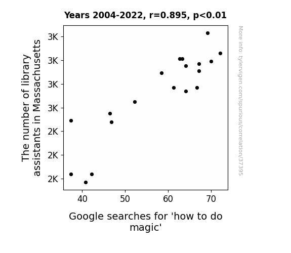This means 80.2% of the change in the one variable (i.e., Google searches for 'how to do magic') is predictable based on the change in the other (i.e., The number of library assistants in Massachusetts) over the 19 years from 2004 through 2022.