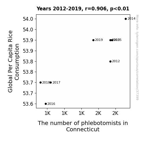 This means 82% of the change in the one variable (i.e., The number of phlebotomists in Connecticut) is predictable based on the change in the other (i.e., Global Per Capita Rice Consumption) over the 8 years from 2012 through 2019.