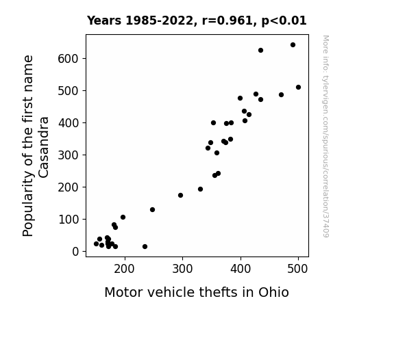 This means 92.3% of the change in the one variable (i.e., Motor vehicle thefts in Ohio) is predictable based on the change in the other (i.e., Popularity of the first name Casandra) over the 38 years from 1985 through 2022.