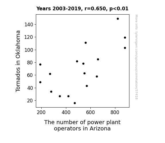 This means 42.3% of the change in the one variable (i.e., The number of power plant operators in Arizona) is predictable based on the change in the other (i.e., Tornados in Oklahoma) over the 17 years from 2003 through 2019.