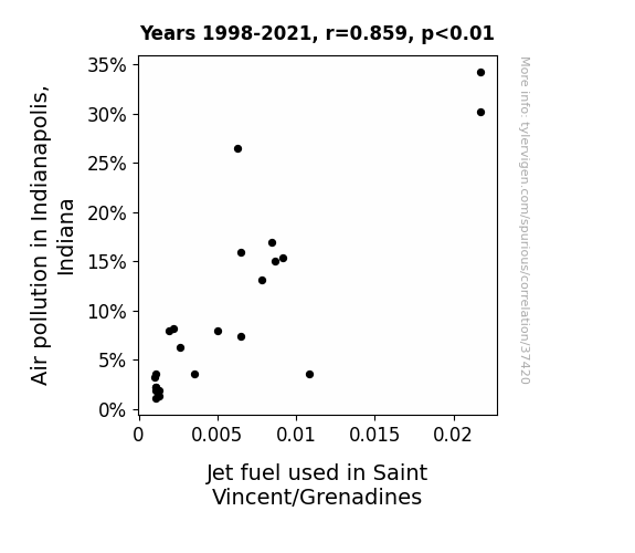 This means 73.8% of the change in the one variable (i.e., Jet fuel used in Saint Vincent/Grenadines) is predictable based on the change in the other (i.e., Air pollution in Indianapolis, Indiana) over the 24 years from 1998 through 2021.