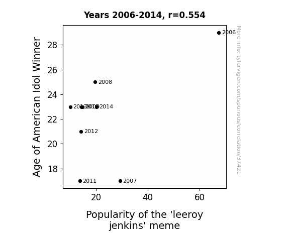 This means 30.7% of the change in the one variable (i.e., Popularity of the 'leeroy jenkins' meme) is predictable based on the change in the other (i.e., Age of American Idol Winner) over the 9 years from 2006 through 2014.