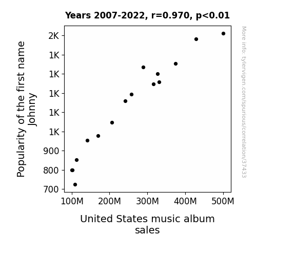 This means 94.1% of the change in the one variable (i.e., United States music album sales) is predictable based on the change in the other (i.e., Popularity of the first name Johnny) over the 16 years from 2007 through 2022.