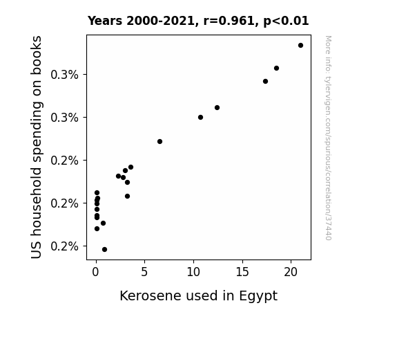 This means 92.3% of the change in the one variable (i.e., Kerosene used in Egypt) is predictable based on the change in the other (i.e., US household spending on books) over the 22 years from 2000 through 2021.