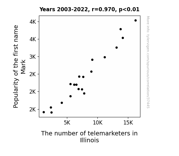This means 94.1% of the change in the one variable (i.e., The number of telemarketers in Illinois) is predictable based on the change in the other (i.e., Popularity of the first name Mark) over the 20 years from 2003 through 2022.