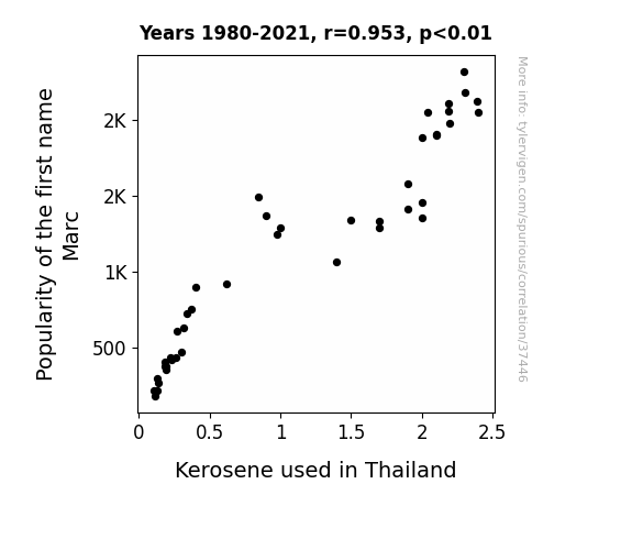 This means 90.7% of the change in the one variable (i.e., Kerosene used in Thailand) is predictable based on the change in the other (i.e., Popularity of the first name Marc) over the 42 years from 1980 through 2021.