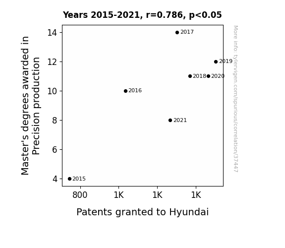This means 61.8% of the change in the one variable (i.e., Patents granted to Hyundai) is predictable based on the change in the other (i.e., Master's degrees awarded in Precision production) over the 7 years from 2015 through 2021.