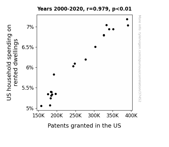 This means 95.8% of the change in the one variable (i.e., Patents granted in the US) is predictable based on the change in the other (i.e., US household spending on rented dwellings) over the 21 years from 2000 through 2020.