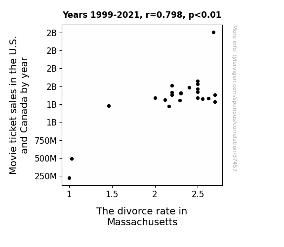 This means 63.7% of the change in the one variable (i.e., The divorce rate in Massachusetts) is predictable based on the change in the other (i.e., Movie ticket sales in the U.S. and Canada by year) over the 23 years from 1999 through 2021.
