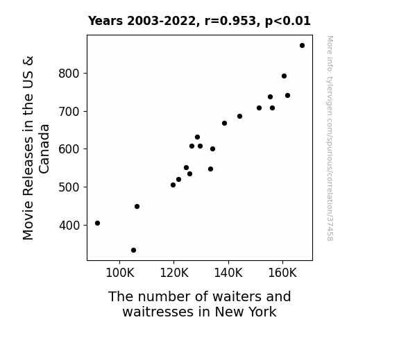 This means 90.9% of the change in the one variable (i.e., The number of waiters and waitresses in New York) is predictable based on the change in the other (i.e., Movie Releases in the US & Canada) over the 20 years from 2003 through 2022.