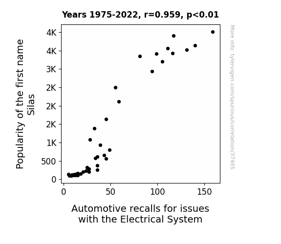 This means 92% of the change in the one variable (i.e., Automotive recalls for issues with the Electrical System) is predictable based on the change in the other (i.e., Popularity of the first name Silas) over the 48 years from 1975 through 2022.