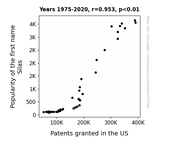 This means 90.7% of the change in the one variable (i.e., Patents granted in the US) is predictable based on the change in the other (i.e., Popularity of the first name Silas) over the 46 years from 1975 through 2020.