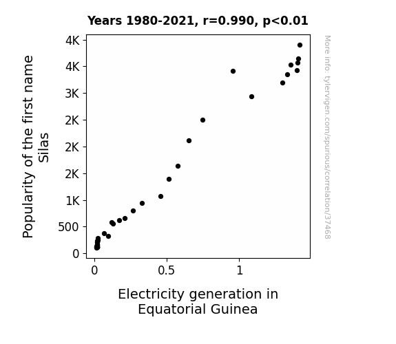 This means 98.1% of the change in the one variable (i.e., Electricity generation in Equatorial Guinea) is predictable based on the change in the other (i.e., Popularity of the first name Silas) over the 42 years from 1980 through 2021.
