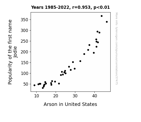 This means 90.8% of the change in the one variable (i.e., Arson in United States) is predictable based on the change in the other (i.e., Popularity of the first name Jodie) over the 38 years from 1985 through 2022.