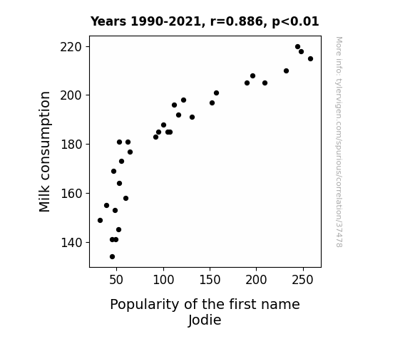 This means 78.5% of the change in the one variable (i.e., Popularity of the first name Jodie) is predictable based on the change in the other (i.e., Milk consumption) over the 32 years from 1990 through 2021.
