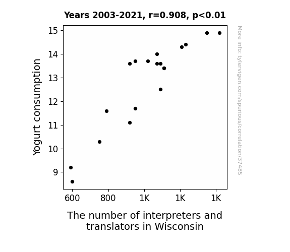 This means 82.5% of the change in the one variable (i.e., The number of interpreters and translators in Wisconsin) is predictable based on the change in the other (i.e., Yogurt consumption) over the 19 years from 2003 through 2021.
