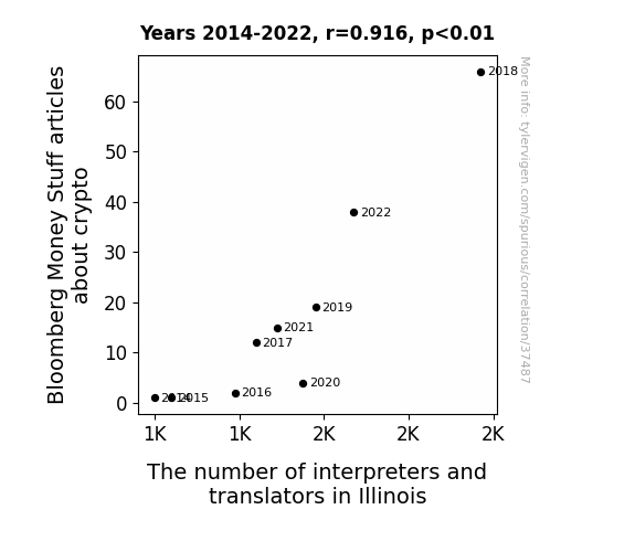 This means 84% of the change in the one variable (i.e., The number of interpreters and translators in Illinois) is predictable based on the change in the other (i.e., Bloomberg Money Stuff articles about crypto) over the 9 years from 2014 through 2022.