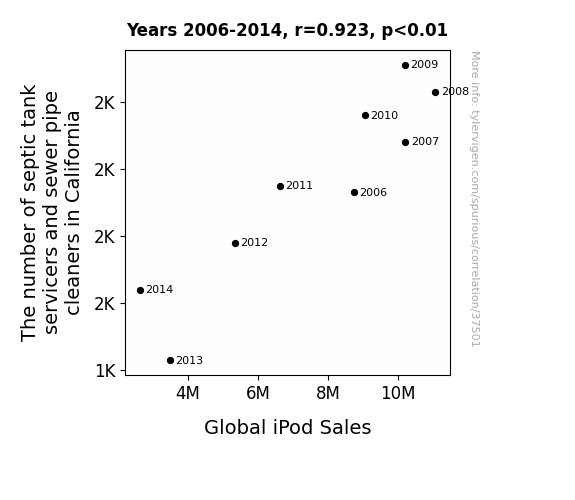 This means 85.2% of the change in the one variable (i.e., Global iPod Sales) is predictable based on the change in the other (i.e., The number of septic tank servicers and sewer pipe cleaners in California) over the 9 years from 2006 through 2014.