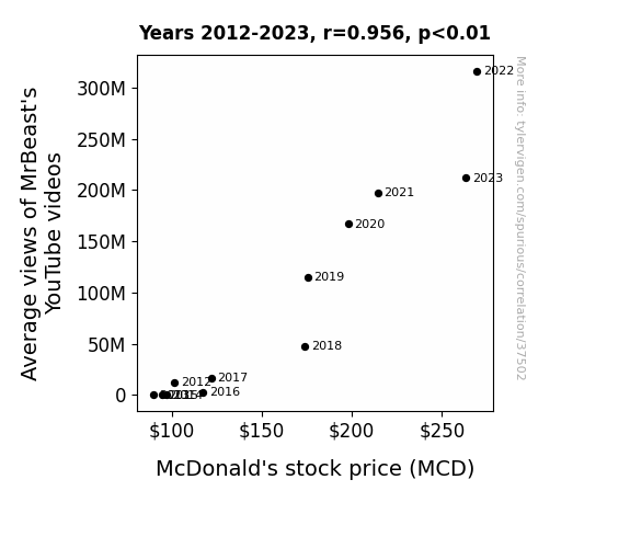 This means 91.5% of the change in the one variable (i.e., McDonald's stock price (MCD)) is predictable based on the change in the other (i.e., Average views of MrBeast's YouTube videos) over the 12 years from 2012 through 2023.