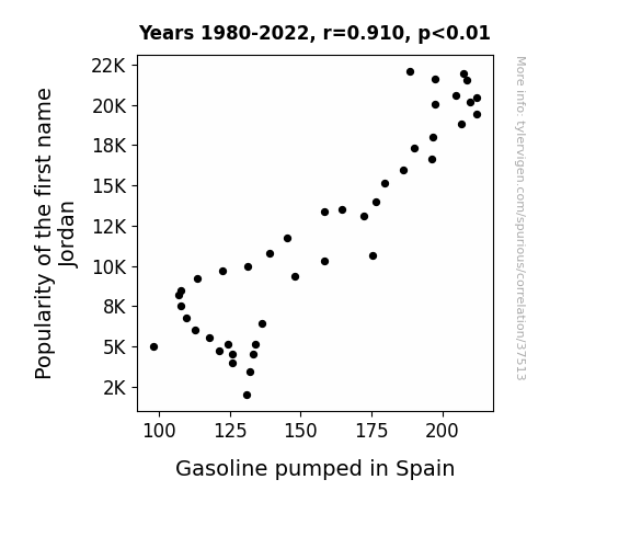 This means 82.9% of the change in the one variable (i.e., Gasoline pumped in Spain) is predictable based on the change in the other (i.e., Popularity of the first name Jordan) over the 43 years from 1980 through 2022.