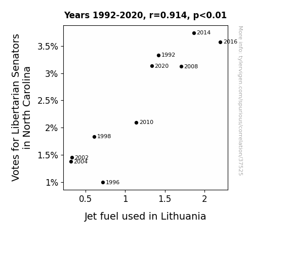 This means 83.6% of the change in the one variable (i.e., Jet fuel used in Lithuania) is predictable based on the change in the other (i.e., Votes for Libertarian Senators in North Carolina) over the 10 years from 1992 through 2020.