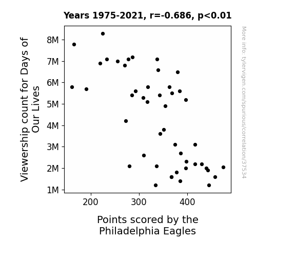 This means 47.1% of the change in the one variable (i.e., Points scored by the Philadelphia Eagles) is predictable based on the change in the other (i.e., Viewership count for Days of Our Lives) over the 47 years from 1975 through 2021.