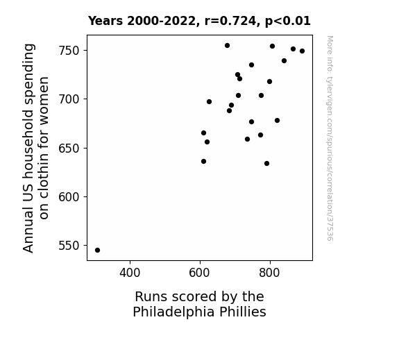 This means 52.5% of the change in the one variable (i.e., Runs scored by the Philadelphia Phillies) is predictable based on the change in the other (i.e., Annual US household spending on clothin for women) over the 23 years from 2000 through 2022.