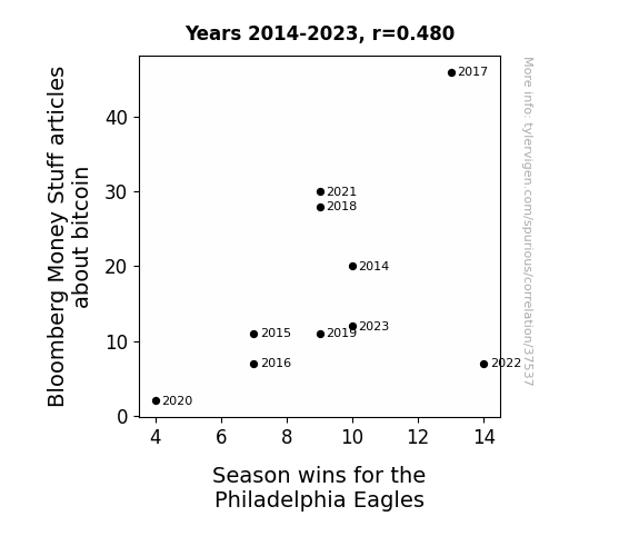 This means 23.1% of the change in the one variable (i.e., Season wins for the Philadelphia Eagles) is predictable based on the change in the other (i.e., Bloomberg Money Stuff articles about bitcoin) over the 10 years from 2014 through 2023.