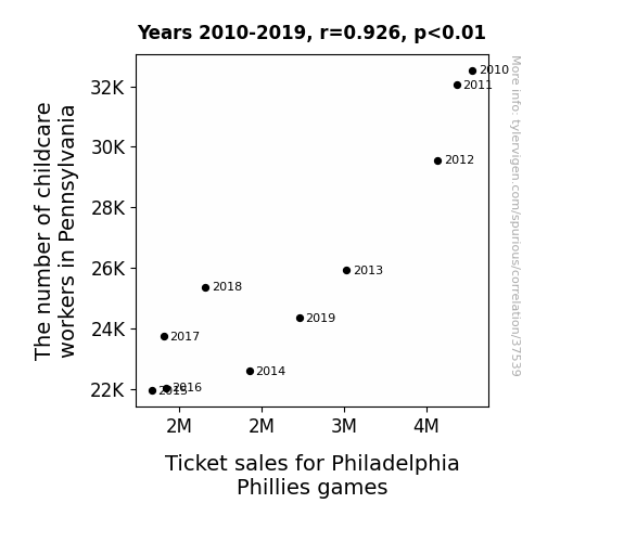 This means 85.8% of the change in the one variable (i.e., Ticket sales for Philadelphia Phillies games) is predictable based on the change in the other (i.e., The number of childcare workers in Pennsylvania) over the 10 years from 2010 through 2019.