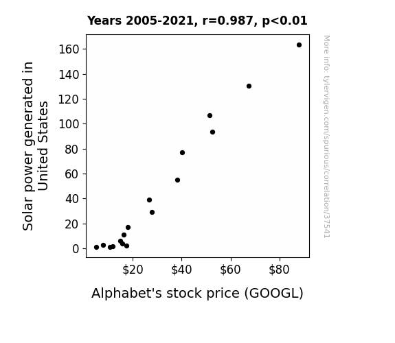 This means 97.4% of the change in the one variable (i.e., Alphabet's stock price (GOOGL)) is predictable based on the change in the other (i.e., Solar power generated in United States) over the 17 years from 2005 through 2021.
