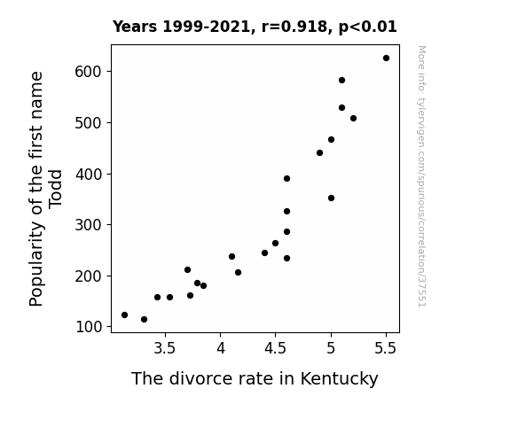 This means 84.3% of the change in the one variable (i.e., The divorce rate in Kentucky) is predictable based on the change in the other (i.e., Popularity of the first name Todd) over the 23 years from 1999 through 2021.