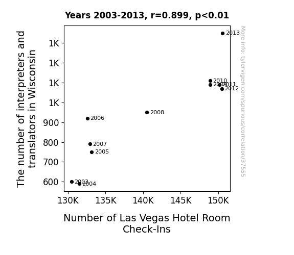 This means 80.8% of the change in the one variable (i.e., Number of Las Vegas Hotel Room Check-Ins) is predictable based on the change in the other (i.e., The number of interpreters and translators in Wisconsin) over the 11 years from 2003 through 2013.